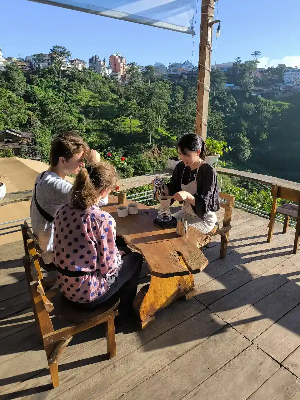 טעימות של סוגי קפה מקומיים מול הנוף ההררי של דא לאט.