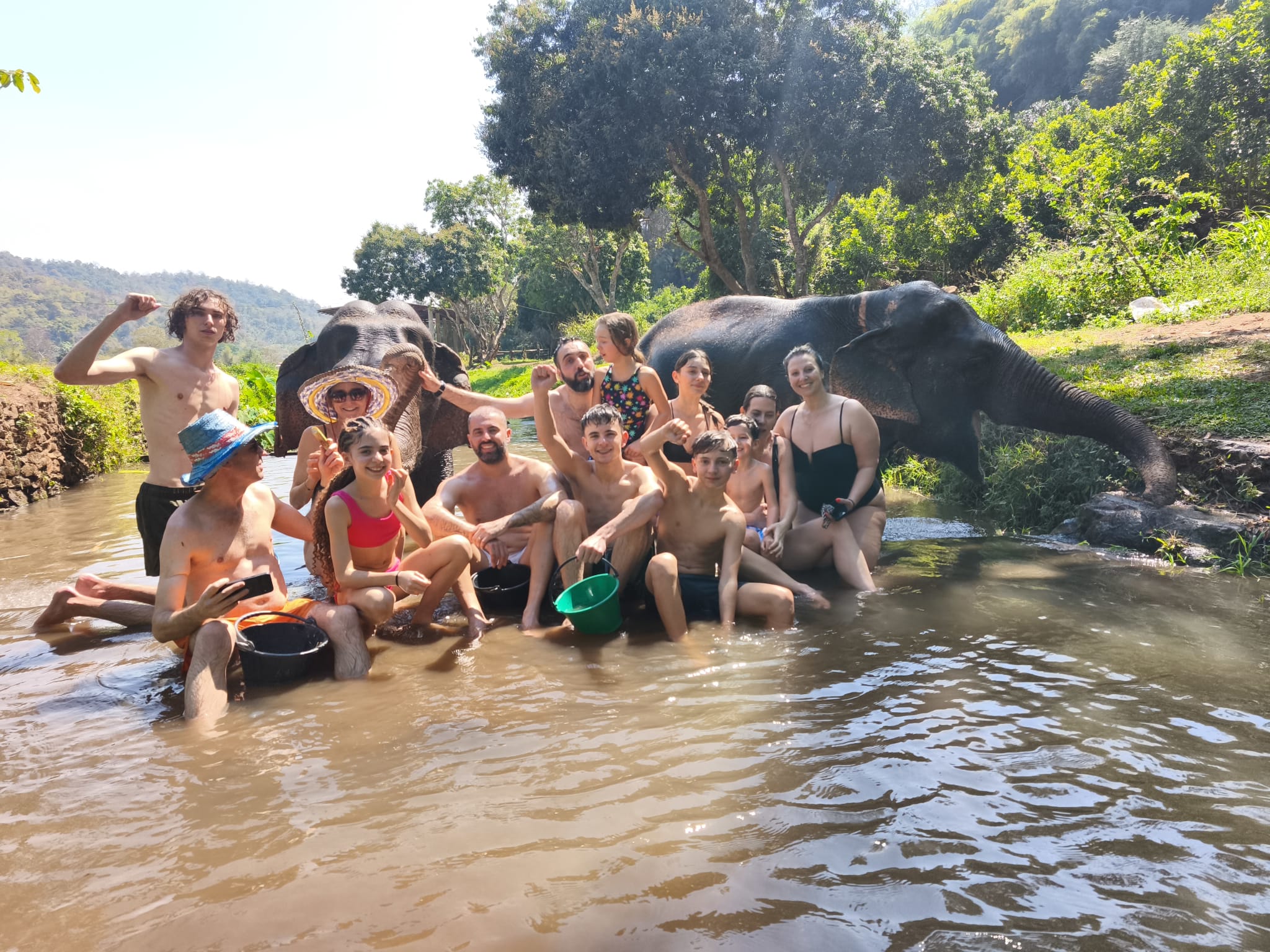רחצה משותפת בנהר וטיפול אישי בפילים זקנים בחוות פילים אתית בצ'יאנג מאי המקפידה על קבוצות קטנות.